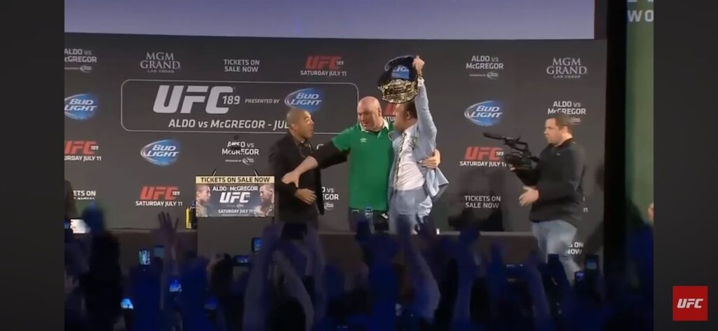 Parte essencial para o enorme apelo ao evento foram as campanhas de marketing e as provocações de McGregor antes da luta. O irlandês provocou o brasileiro em diversas turnês de imprensa globais, chegando até a “roubar” o cinturão de Aldo em um evento realizado no Brasil, tornando o clima da luta cada vez mais hostil.