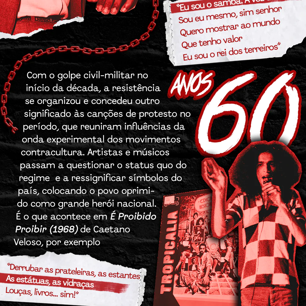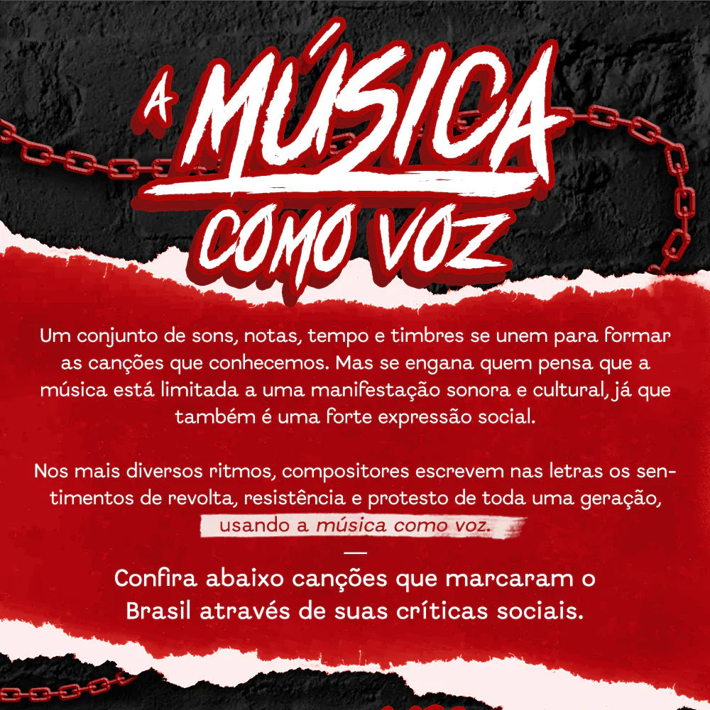Um conjunto de sons, notas, tempo e timbres se une para formar as canções que conhecemos. Mas se engana quem pensa que a música está limitada a uma manifestação sonora e cultural, já que também é uma forte expressão social. Nos mais diversos ritmos, compositores escrevem nas letras os sentimentos de revolta, resistência e protesto de toda uma geração, usando a música como voz. Nesse infográfico de Miriã Gama, Pedro Malta, Davi Madorra e Filipe Moraes, entenda como as canções de protesto mudaram para sempre a história da música brasileira.
