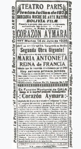 Foi apenas em 1920 que o cinema boliviano surgiu. O pioneiro foi o italiano Pedro Sambarino, produtor de documentários e responsável pelo primeiro filme de ficção do país: o longa perdido Corazón Aymara (1925), que acompanha a história de uma mulher que luta contra acusações de infidelidade. Apesar disso, a primeira exibição cinematográfica do país ocorreu em 1897 e, em 1904, foram realizadas filmagens para o filme Retratos de Personajes históricos y de actualidad (1904).