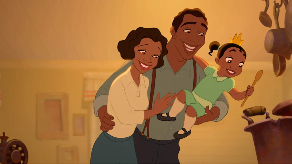 Outra produção da Disney que reforça a lógica meritocrática é A Princesa e o Sapo (The Princess And The Frog, 2009). Ela narra a história de Tiana (Anika Noni Rose), uma mulher negra de Nova Orleans que herda de seu pai o sonho de ter o próprio restaurante. Depois de anos de economias e trabalho duro, a moça vê a realização de seu sonho distanciar-se quando o valor do salão que planejava comprar aumenta.