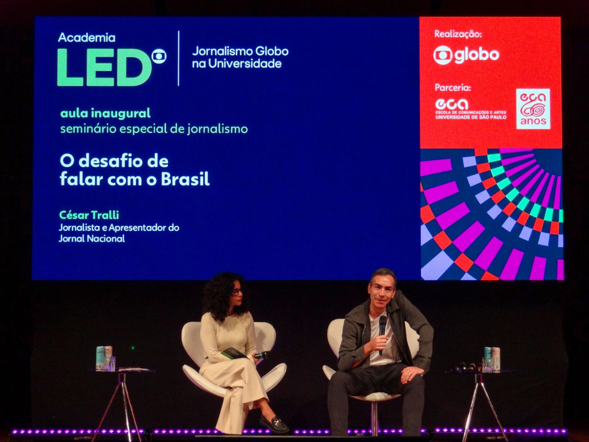 O jornalista César Tralli, âncora do Jornal Nacional, ministrou na segunda-feira, 2 de março, a aula inaugural do curso de extensão “Tendências do Jornalismo Contemporâneo” para estudantes da Escola de Comunicações e Artes da Universidade de São Paulo (ECA-USP). O evento marcou a abertura do seminário, fruto da parceria entre a USP e a TV Globo, por meio da Academia LED | Jornalismo Globo na Universidade, e reuniu alunos no Anfiteatro Camargo Guarnieri, na Cidade Universitária.
