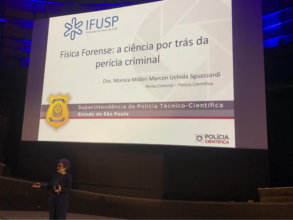 Balística e padrões de mancha de sangue são algumas das aplicações da física no campo forense. Monica comentou que a balística não se preocupa apenas com o projétil que foi disparado pela arma, pois o estojo e a análise das marcas de tiro também são importantes. “Quando a gente dá um tiro com uma pistola, o projétil sai pelo cano, pela parte da frente, e o estojo pula para fora”, explica. De acordo com a posição do estojo, pode-se determinar a localização do atirador no momento do tiro.