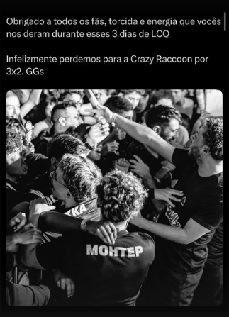 Nos stories do Instagram, a conta do time publicou o seguinte texto seguido de uma foto dos jogadores com a torcida: “Obrigado a todos os fãs, torcida e energia que vocês nos deram durante esses três dias de LCQ. Infelizmente, perdemos para o Crazy Raccoon por 3×2.”
