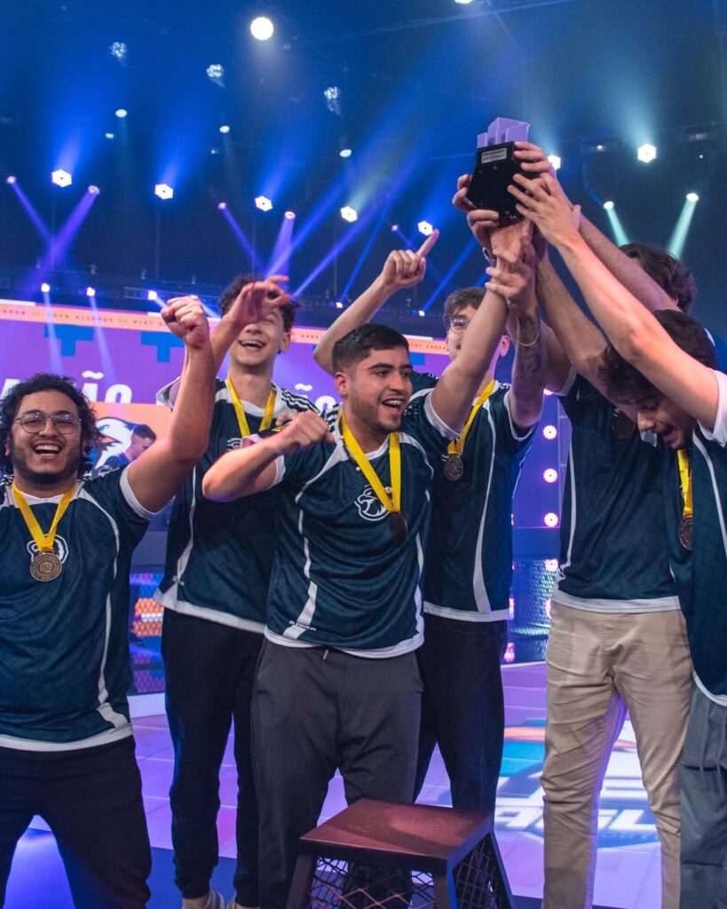Equipe da Azure Bears erguendo o troféu de campeão da Copa Aliança na modalidade de League of Legends [Imagem: Leonardo Sang via reprodução/Instagram: @copaaliancagg]