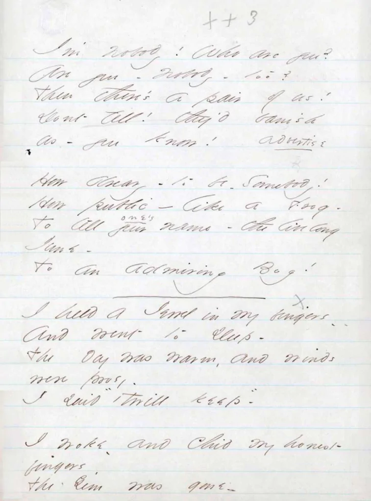 Ele também chama atenção para um dos poemas mais conhecidos da autora,“I’m Nobody! Who are you?”, onde ela descreve a negação do sucesso material.