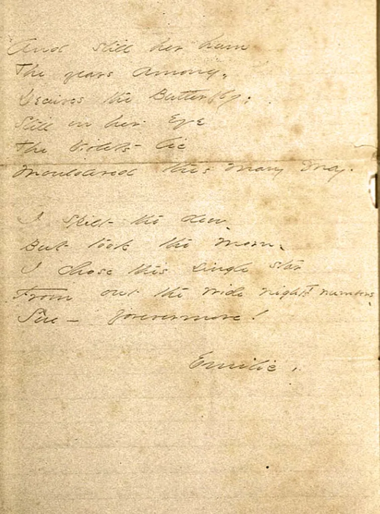 Emily Elizabeth Dickinson nasceu no dia 10 de dezembro de 1830 em Amherst, Massachusetts, nos Estados Unidos. Famosa por sua escrita intimista, enigmática e ousada, Dickinson é considerada uma das principais escritoras norte-americanas do século XIX. Apesar de sua originalidade, a poetisa passou sua vida em anonimato; suas obras foram publicadas postumamente.