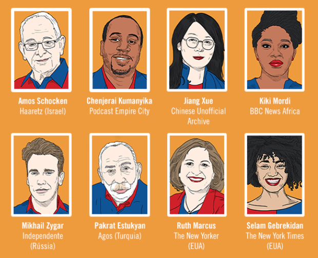 Além deles, o evento contará com mesas protagonizadas por Chenjerai Kumanyika, criador do podcast Empire City, sobre a história e origem racista da polícia de Nova York; Kiki Mordi, criadora do documentário Sex for grades (BBC News Africa), sobre casos de assédio em universidades da Nigéria e de Gana; Mikhail Zygar, repórter russo autor de livros sobre conspirações e corrupção do governo Putin; Ruth Marcus, jornalista do The Washington Post que cobre o governo Trump; e Selam Gebrekidan, do The New York Times, coautora de uma investigação sobre a exploração do Haiti pela França.