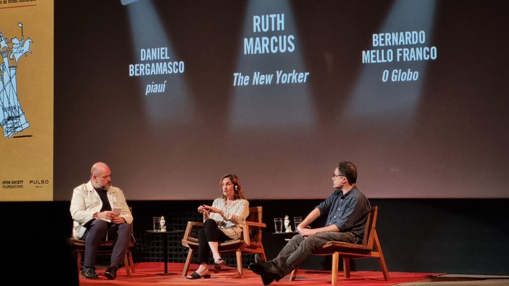 Ruth aponta, porém, que há sim limites na Suprema Corte para esse presidente e esses apoiadores. Ela controla o alarmismo e apresenta como exemplo um caso no primeiro governo Trump, no qual ele tentou anular a cidadania de pessoas nascidas nos Estados Unidos, com pais estrangeiros. A cidadania é fundamental para a Constituição estadunidense, e não pode ser alterada em um governo, ela aponta. Formada em Direito, Ruth explicou situações de caráter jurídico para a plateia, que compreendia e interagia com a jornalista.
