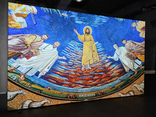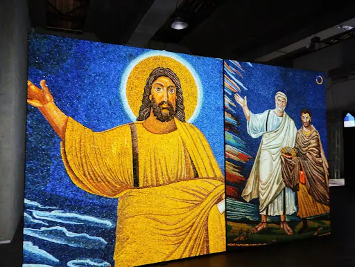 A exposição apresenta três modelos de mosaicos distintos: os que remetem ao cristianismo, os relativos a acontecimentos históricos e os que formam figuras geométricas. Os cristãos, assim como os afrescos, enfeitam ambientes como igrejas e basílicas, além de representar histórias e cenas da tradição católica por meio da figura de Jesus Cristo e outros santos.