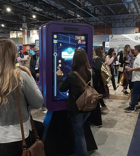 Uma das primeiras coisas que o participante entrava em contato eram os estandes de empresas parceiras da TOTVS, com representantes disponíveis para apresentar as instituições e distribuir brindes. Em frente, também havia uma área com os chamados “pontos de demonstração”, nos quais eram explicadas algumas das soluções tecnológicas fornecidas pela empresa.